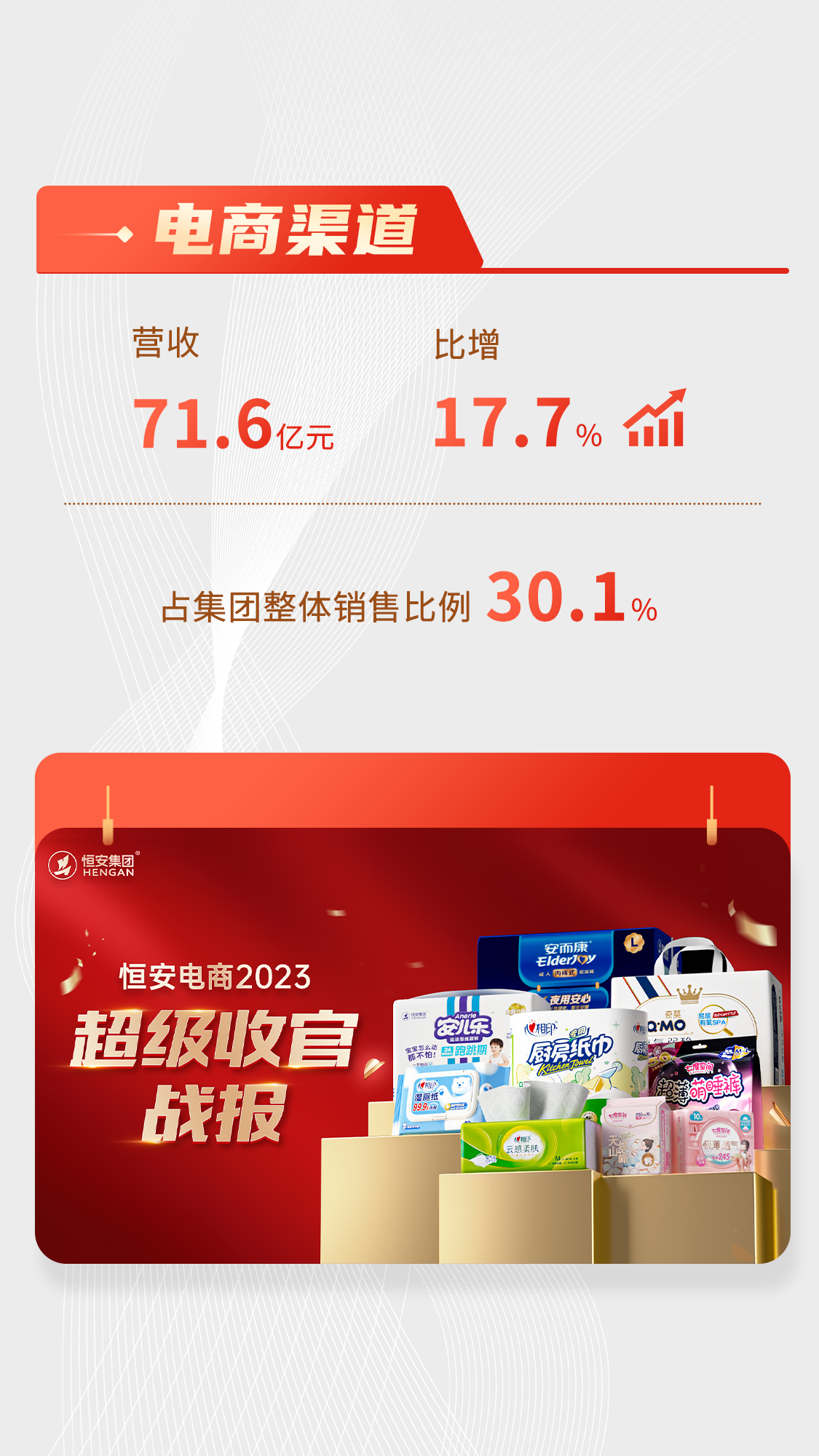 為滿足消費者日益升級的需求,集團持續創新發展并優化其電商及其他新零售渠道。2023年,集團電商及新零售渠道(包括零售通及新通路)保持強勁發展勢頭,年內銷售收入增長超過17.7%至71.6億元,占集團整體銷售比例上升至30.1%。年內,電商及新零售渠道對紙巾業務、衛生巾業務及紙尿褲業務的銷售貢獻分別為35.3%、26.5%及52.8%。
