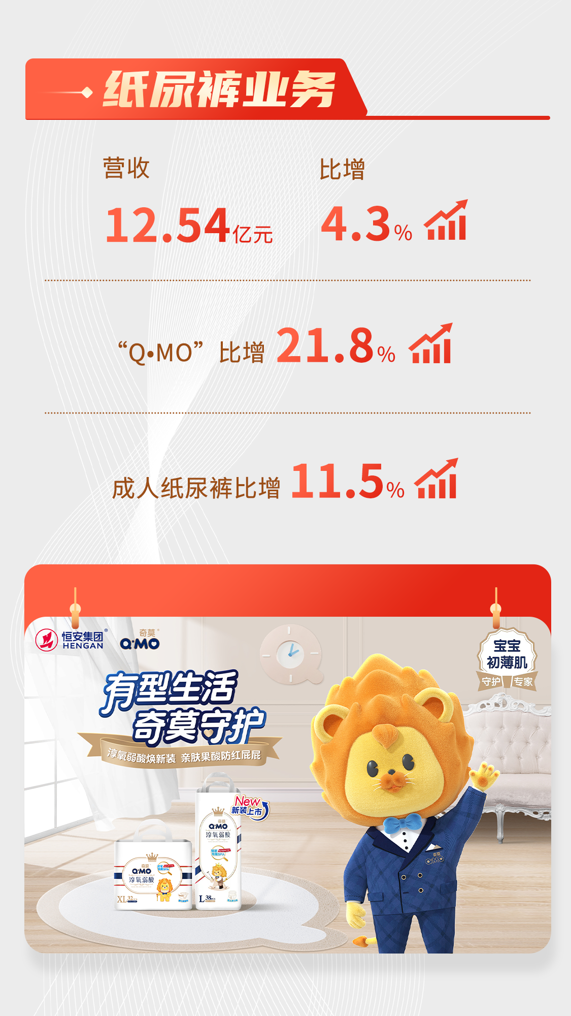 人口持續高齡化持續推動中國成人紙尿褲市場規模擴大,育兒觀念的不斷進步也帶動嬰兒紙尿褲滲透率持續提升,中國紙尿褲市場增長潛力巨大。過去的一年,集團不斷研發優質嬰兒及成人健康護理產品,以迎合消費者日益升級的產品品質需求。2023年,集團紙尿褲業務銷售上升4.3%至12.54億元,占集團整體收入約5.3%。