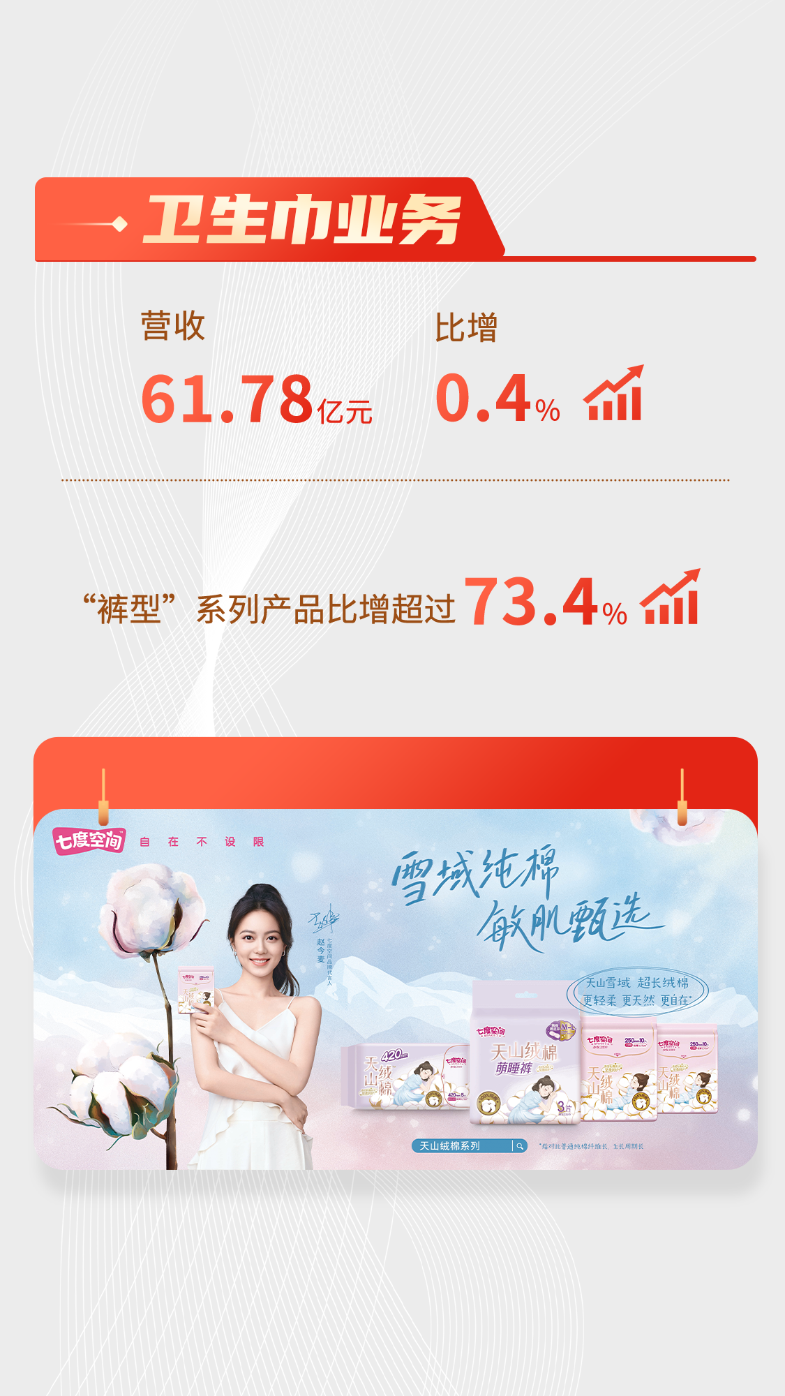 衛生巾業務方面,面對激烈市場競爭及不少國外品牌商的價格促銷策略,集團堅持穩定的定價策略,年度整體銷售取得0.4%增幅達61.78億元,占集團整體收入約26.0%。過去幾年,集團旗下七度空間推出的“極薄”、“加長夜用”和“褲型”等升級產品深受市場歡迎,2023年主推的采用天山雪域稀缺純凈長絨棉的新品“天山絨棉系列”,憑借優良的品質和品牌形象,深受消費者青睞,帶動整體衛生巾業務銷售增長。