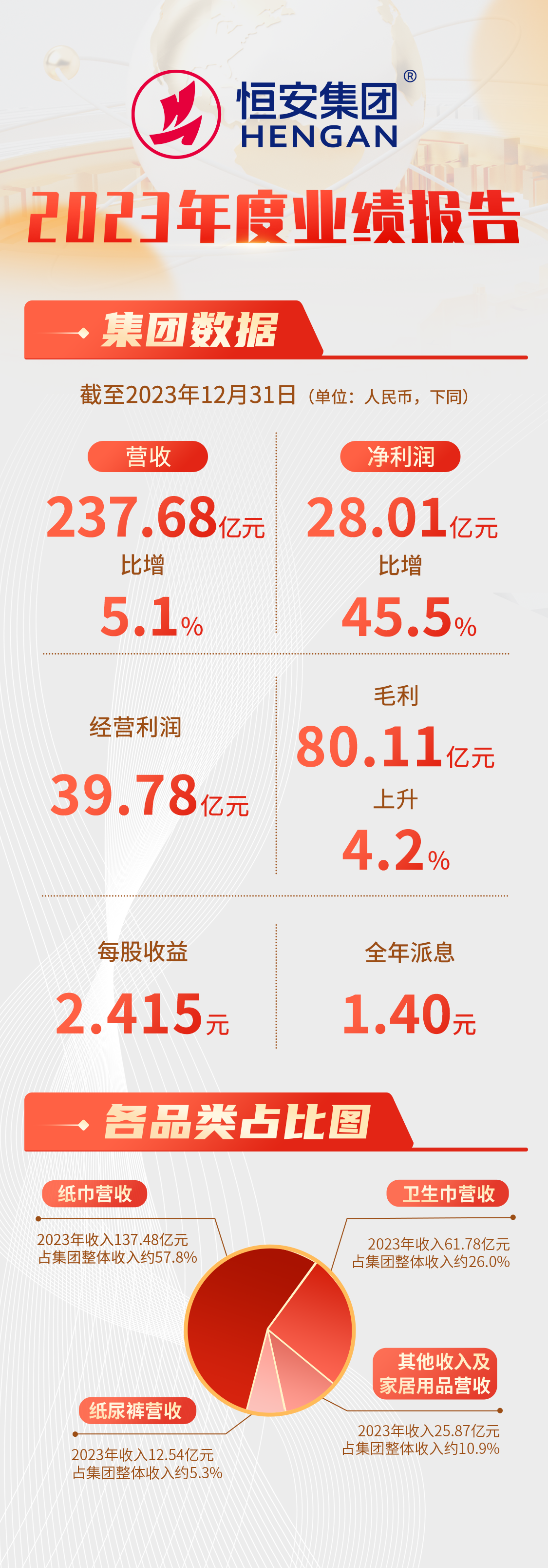 3月21日,恒安國際在香港發布2023年度業績公告。截至2023年12月31日,恒安集團營收同比增長5.1%達237.68億元(人民幣,下同),整體毛利上升4.2%至80.11億元,經營利潤上升38.6%至39.78億元,凈利潤上升45.5%至28.01億元。