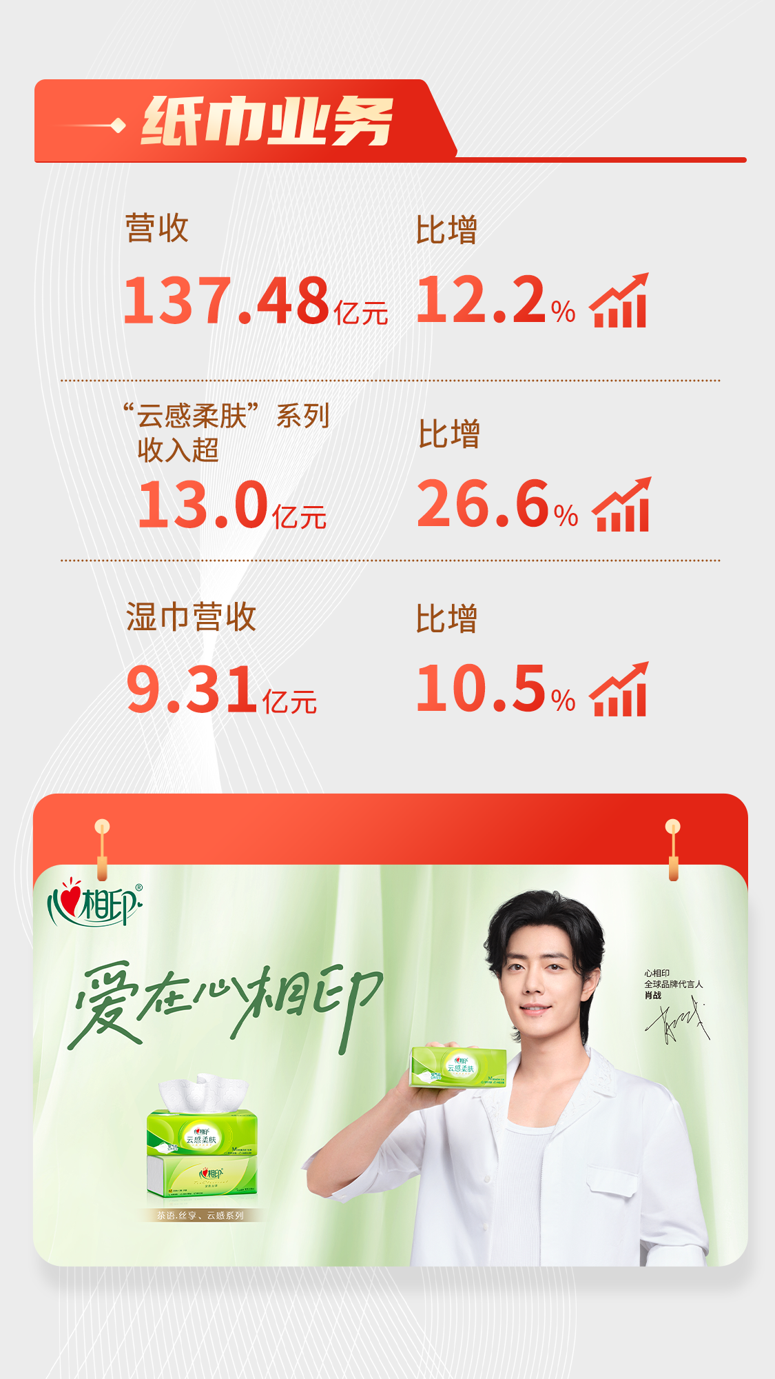 回顧2023年,集團紙巾業務銷售收入上升12.2%至137.48億元,優于行業平均增長水準。紙巾業務銷售占集團整體收入約57.8%。在國民衛生意識提升及消費需求的驅動下,集團高端產品銷售表現亮眼,其中“云感柔膚”系列的銷售收入超13.0億元,同比增長約26.6%,占整體紙巾銷售約12.0%;濕巾業務增長10.5%至9.31億元。在品牌年輕化上,心相印品牌代言人肖戰升級為心相印的品牌全球代言人,以提升品牌影響力。